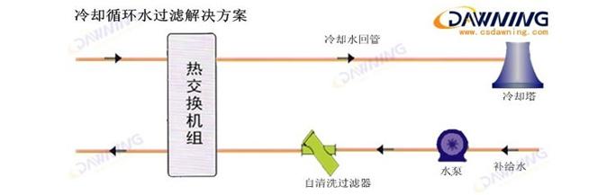 我們?yōu)槠涮峁┑倪^(guò)濾解決方案解決這一問(wèn)題,如上面流程圖所示,我們?cè)谒煤蛽Q熱器之間設(shè)備一臺(tái)自清洗過(guò)濾器(電動(dòng)刷式過(guò)濾器或電動(dòng)式自動(dòng)排污過(guò)濾器),根據(jù)現(xiàn)場(chǎng)實(shí)際情況,選擇相應(yīng)的過(guò)濾網(wǎng)和過(guò)濾精度,這些將保證在不影響水系統(tǒng)正常運(yùn)行的狀況下,自清洗過(guò)濾器會(huì)過(guò)濾掉符合精度的所有雜質(zhì),并在設(shè)定的壓差或時(shí)間范圍內(nèi)自動(dòng)清洗濾網(wǎng)、自動(dòng)排污。自清洗過(guò)濾器的設(shè)置,將大大提高系統(tǒng)的換熱效率、減少系統(tǒng)補(bǔ)水量、提高水的濃縮比,達(dá)到節(jié)水、節(jié)能、環(huán)保的目的。