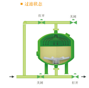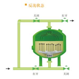 隨時(shí)雜質(zhì)在濾料層中不斷聚積,壓力損失不斷增加,當(dāng)壓差增加到某一設(shè)定值時(shí)或到達(dá)設(shè)定的清洗時(shí),系統(tǒng)將自動(dòng)轉(zhuǎn)換至反洗狀態(tài)。加壓水通過(guò)集水裝置進(jìn)入濾料層,對(duì)其進(jìn)行沖刷,使截留的污染物脫落并排出過(guò)濾系統(tǒng)。反洗持續(xù)至少2分鐘后,閥門自動(dòng)將系統(tǒng)轉(zhuǎn)至過(guò)濾狀態(tài)。